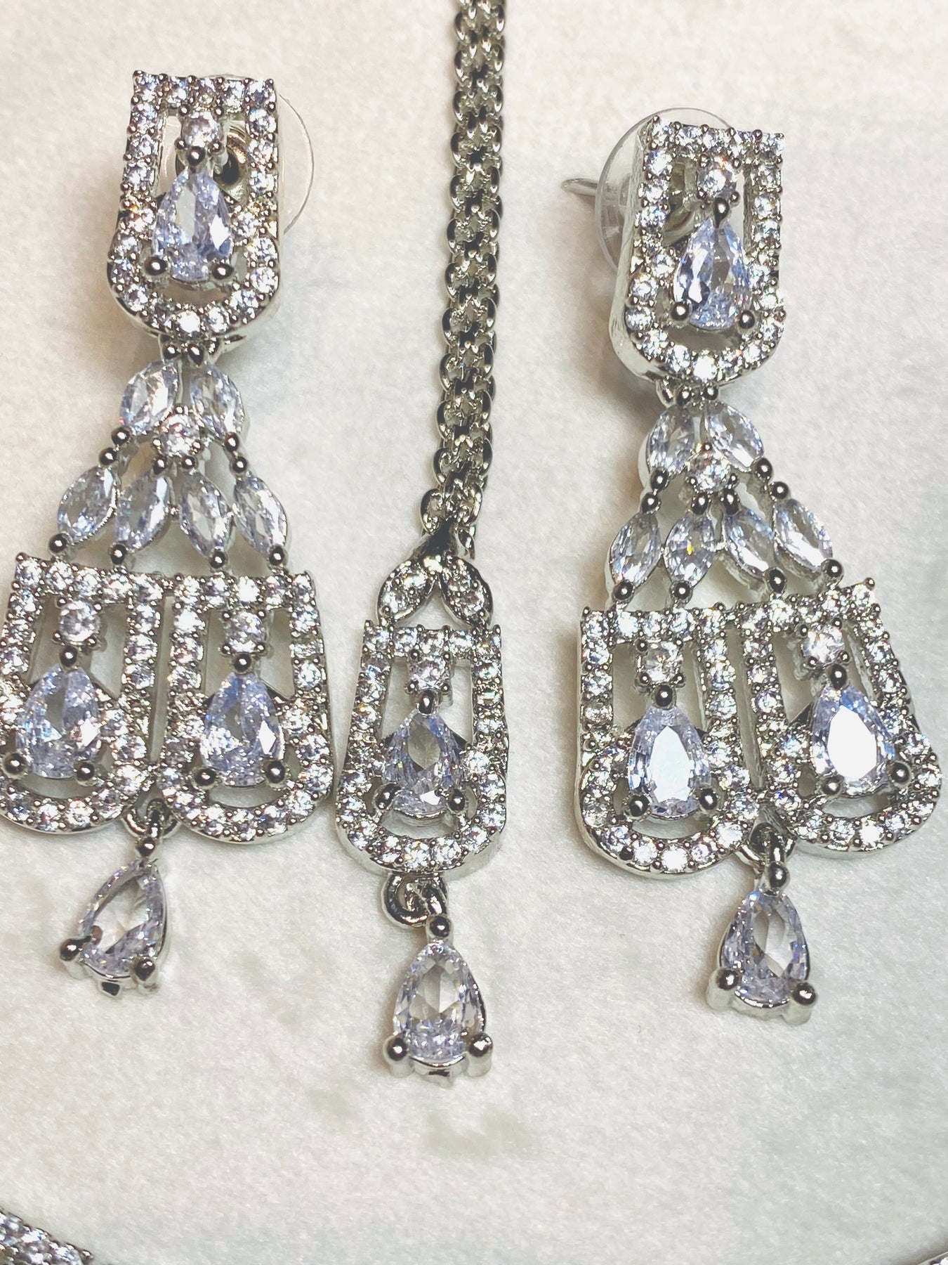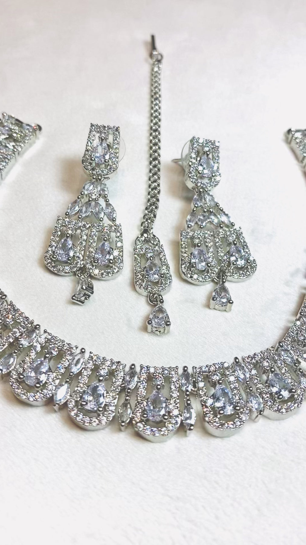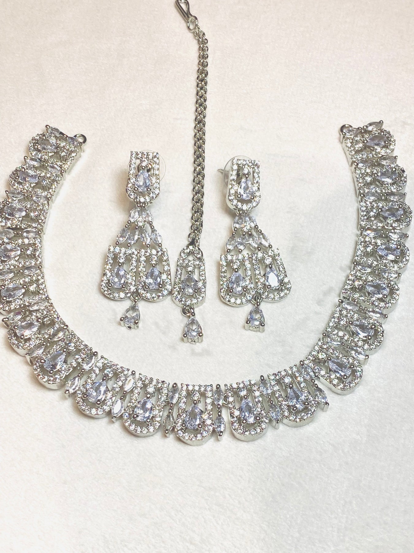 Exquisite Petite Pear-Shaped AD Stonework In Lustrous Silver. This Delicate 3-Piece Set Features A Necklace, Earrings, And Tikka, Each Adorned With Intricate Detailing And Sparkling Stones. The Adjustable Drawstring Ensures A Perfect Fit For All-Day Comfort And Elegance.