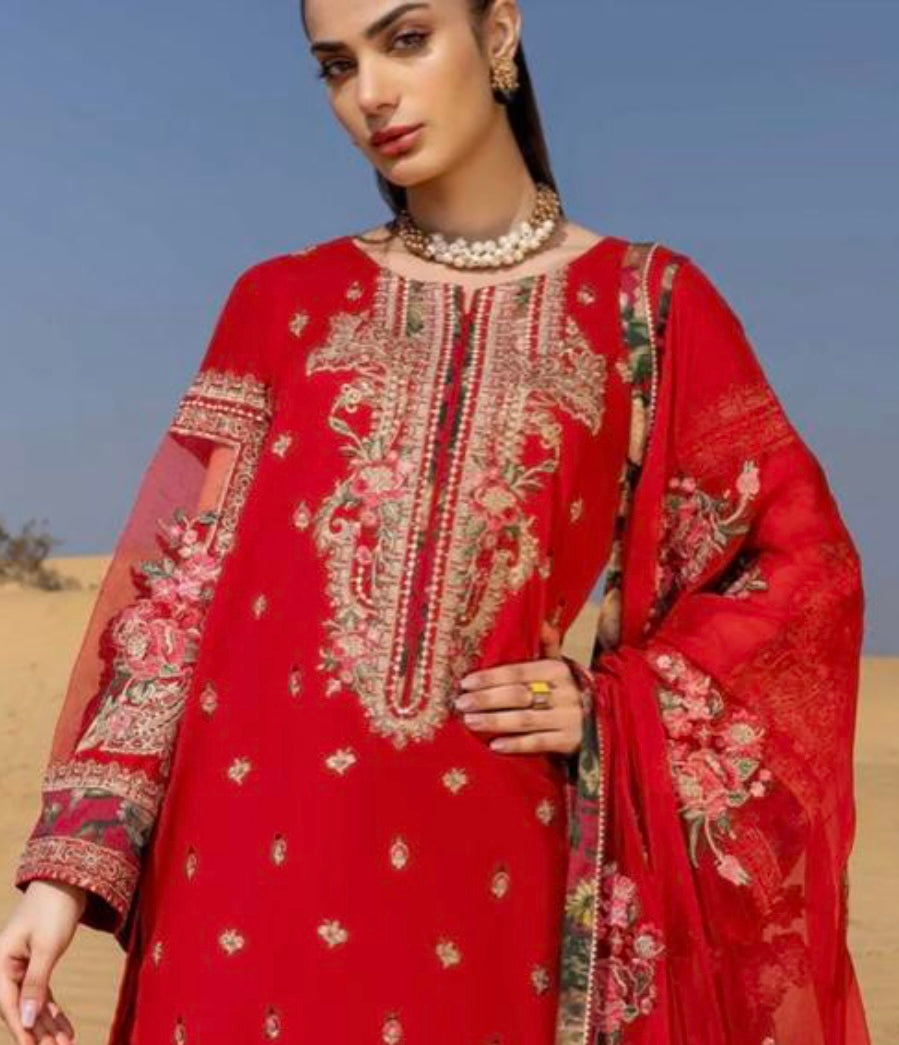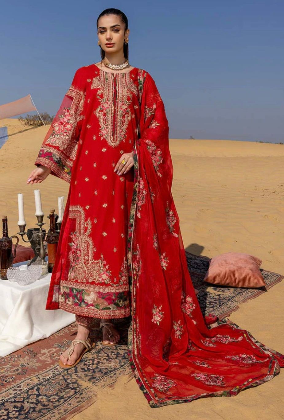 Charizma Luxury Lawn Red 3-Piece Suit With Embroidered In Heavy Gold Thread With Floral Ribbon Detailing With Pure Matching Embroidered Chiffon Dupatta