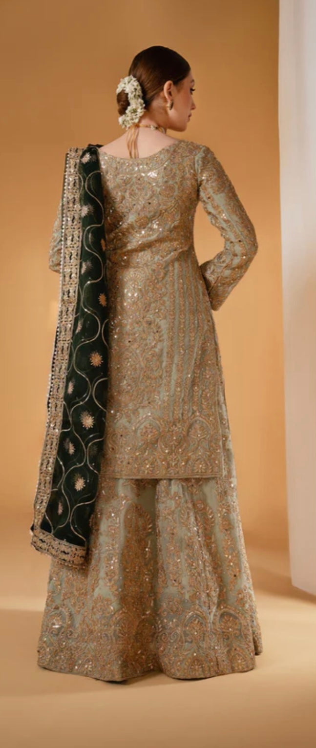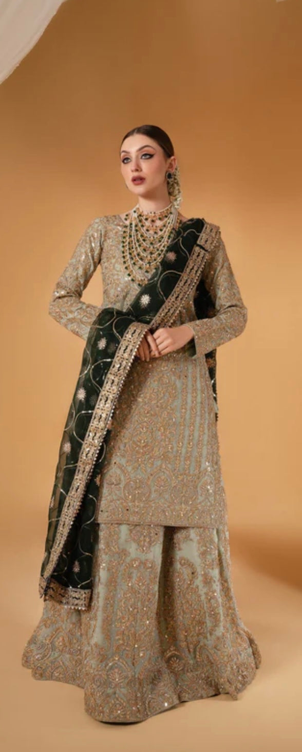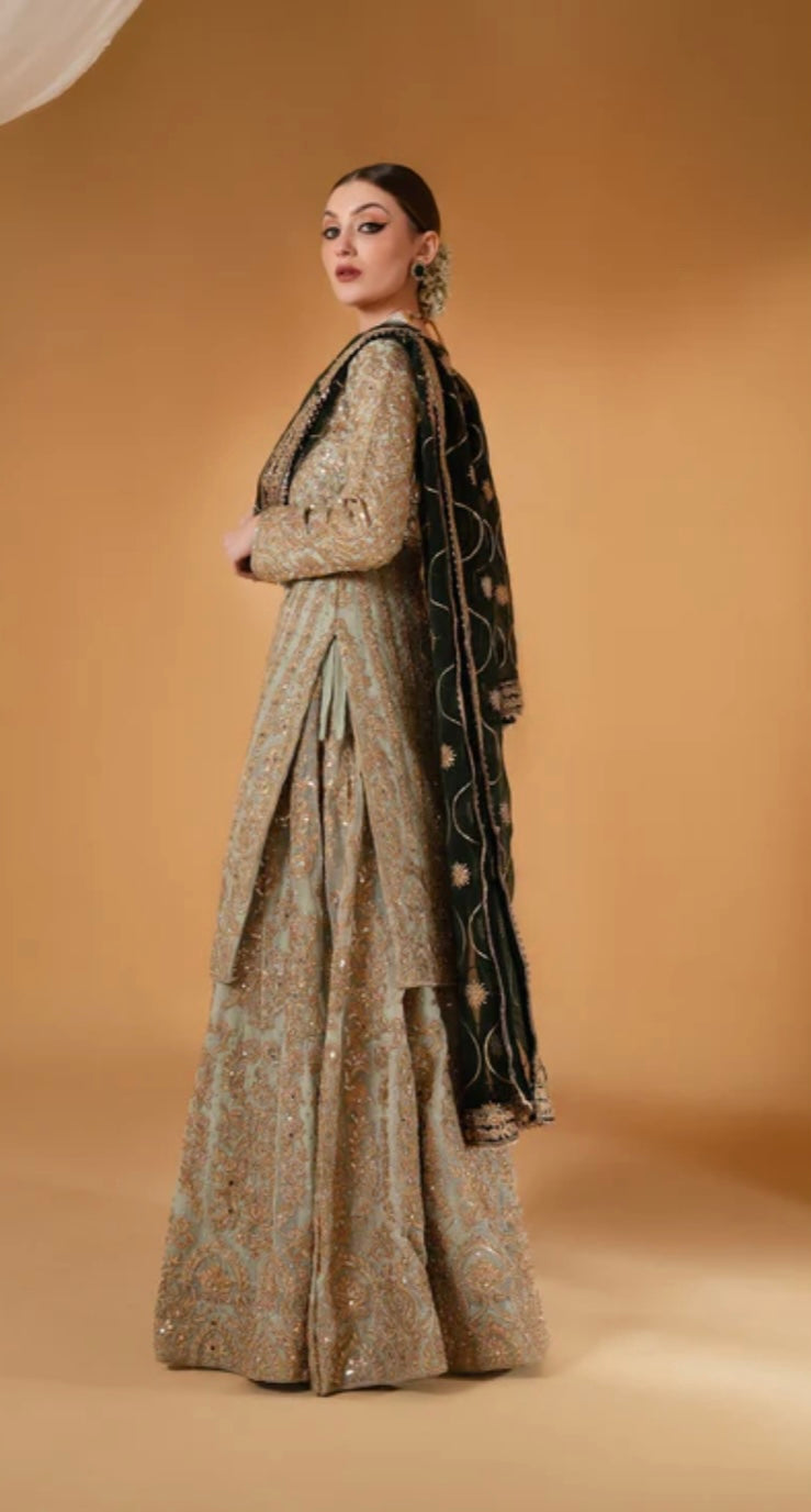 3 Piece Chiffon Panelled Lengha Outfit With Dark Green Organza Dupatta & Potli Bag