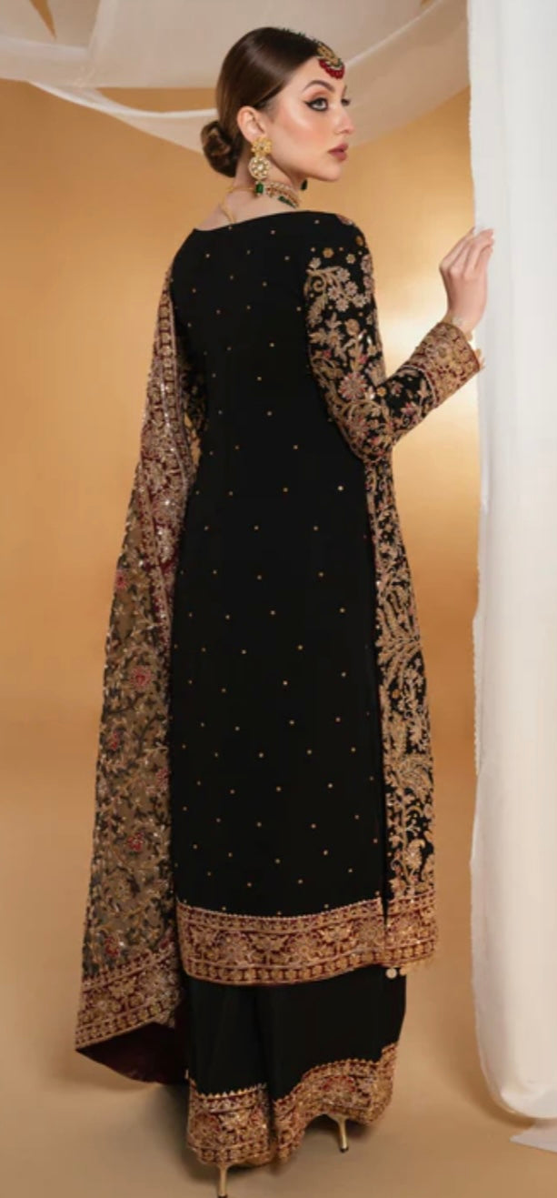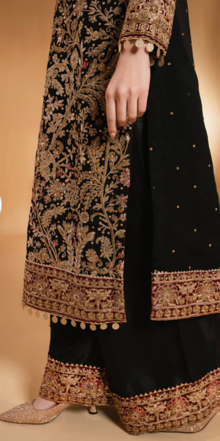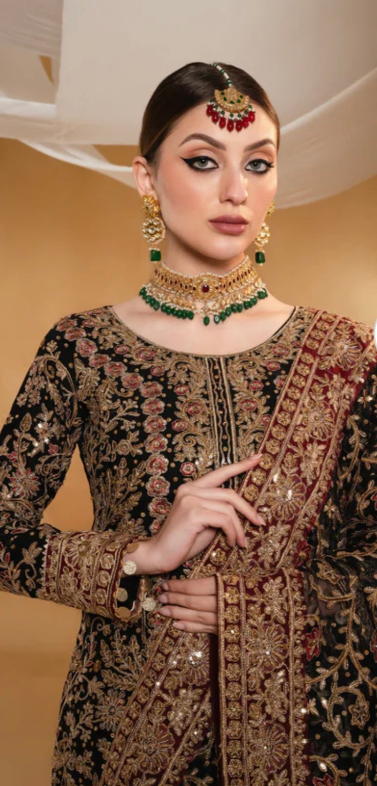 Chiffon Dress with Raw Silk Trousers Chiffon Dupatta & Matching Potli Bag
