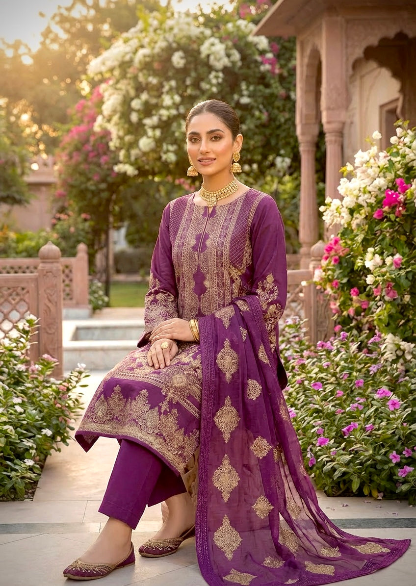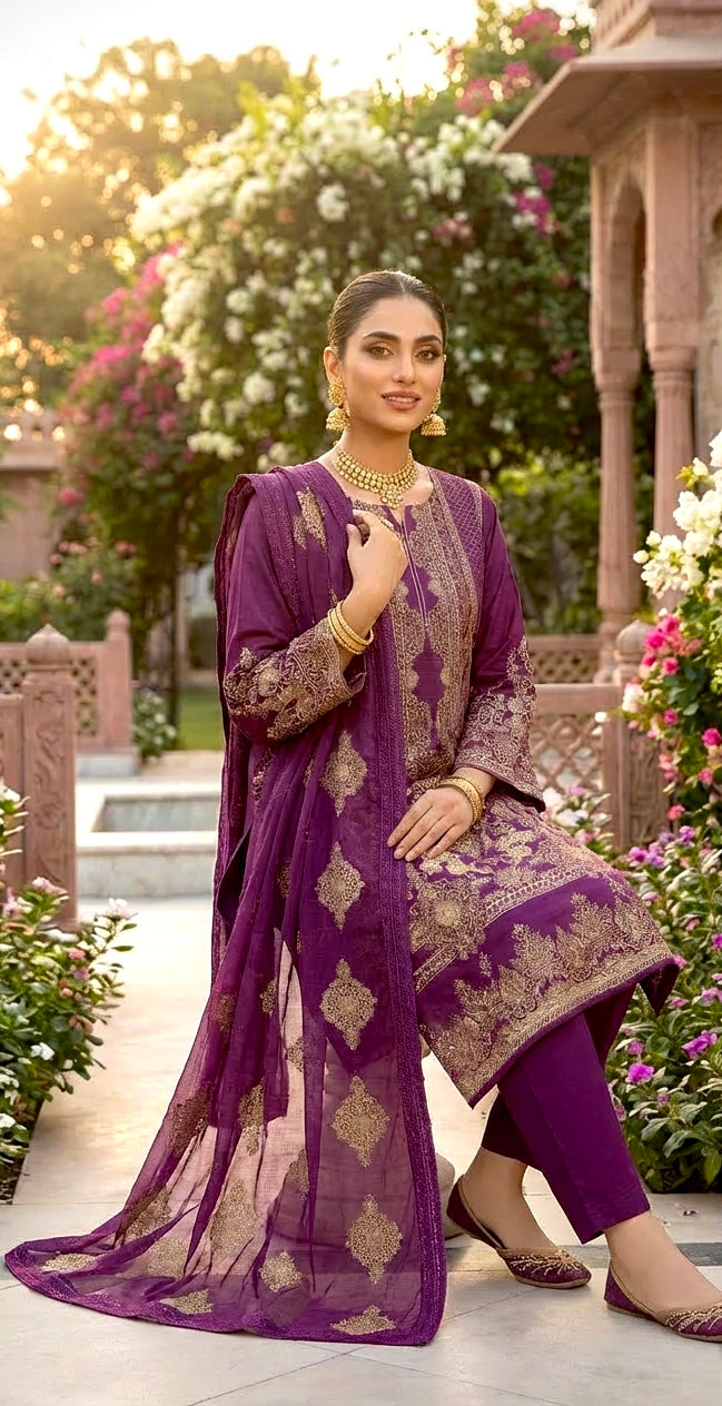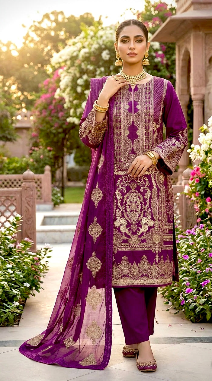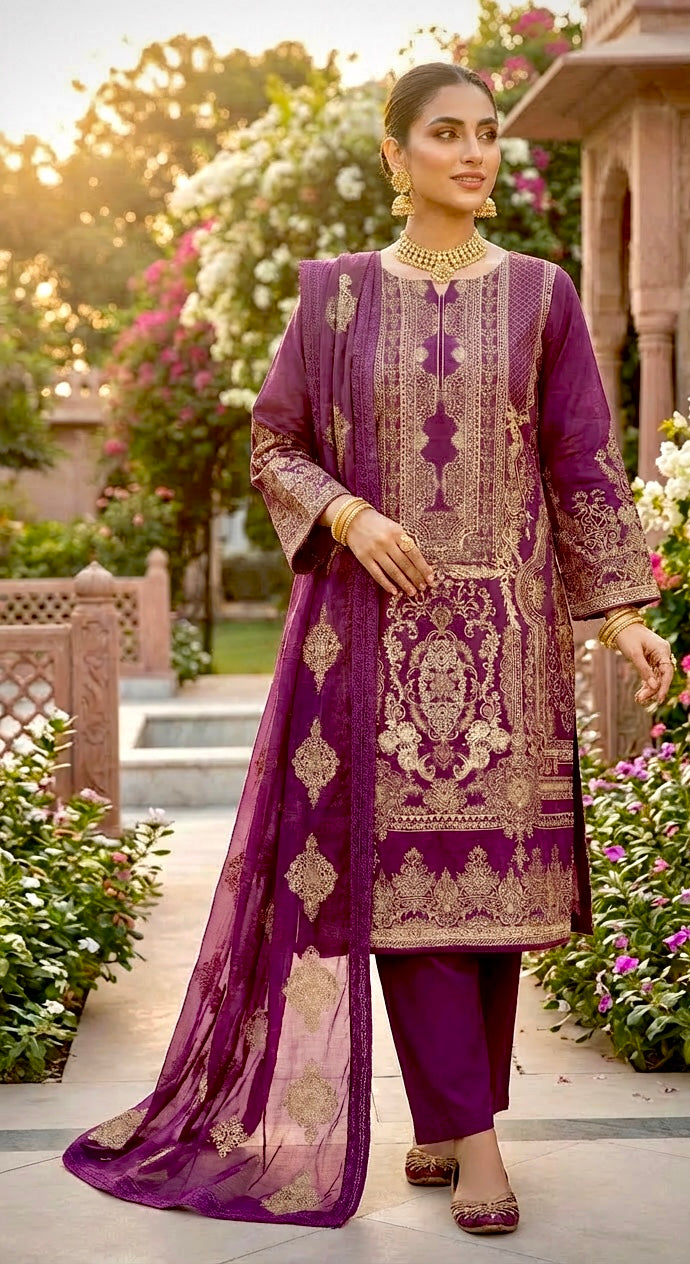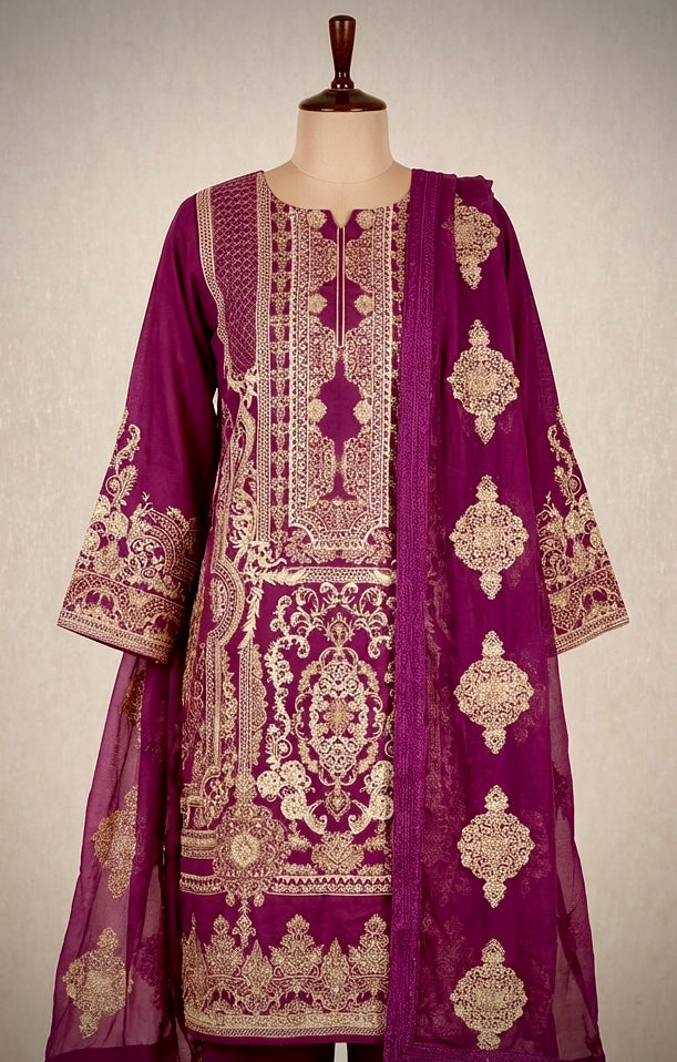 A Beautifully Feminine Magenta Lawn Suit With Antique Gold Embroidery — Elegant And Refined For Formal And Special Occasions. Featuring A Fully Lined Kameez In Luxuriously Soft Lawn Fabric, Paired With A Flowing Chiffon Dupatta For A Graceful, Polished Finish.