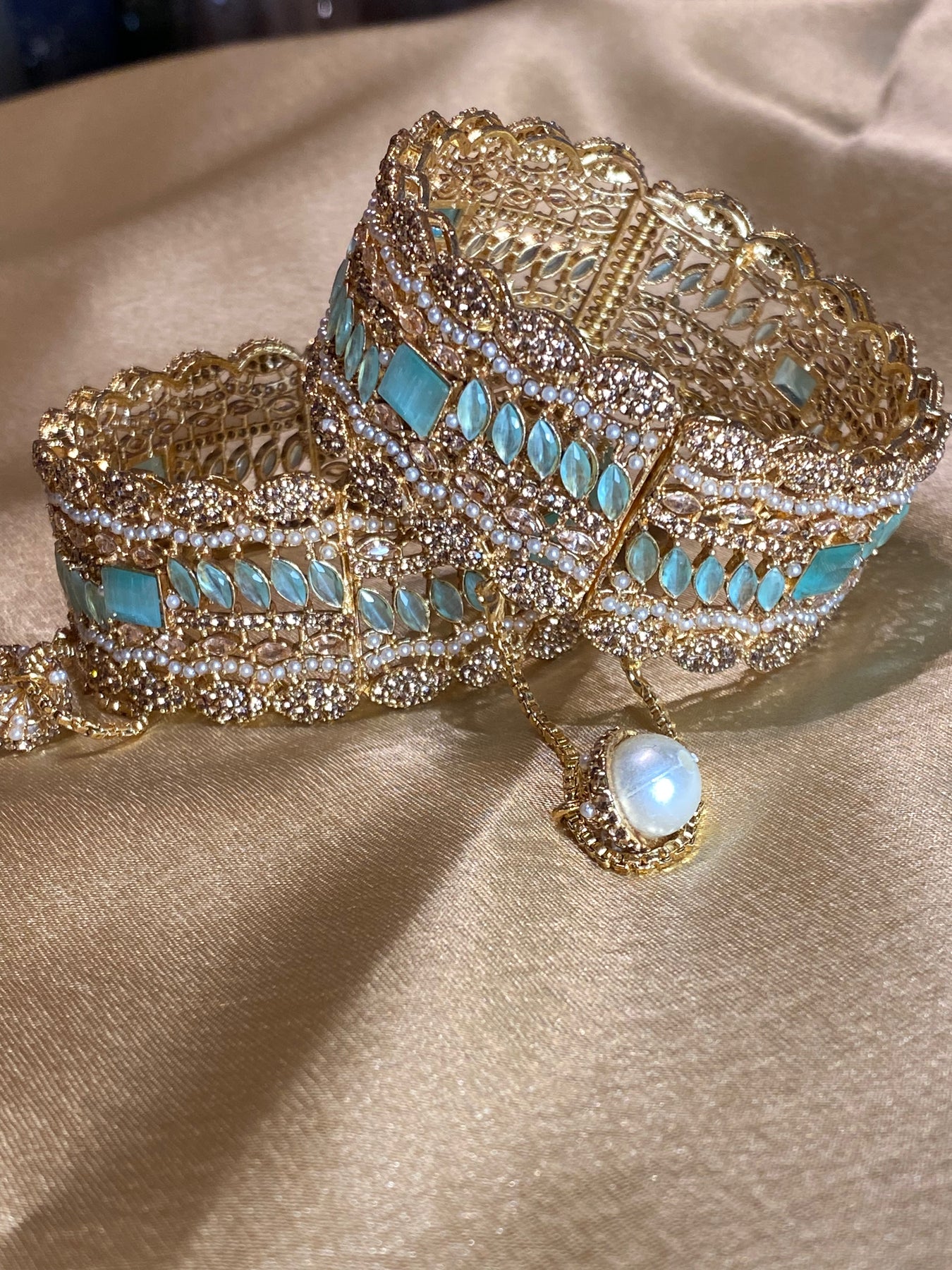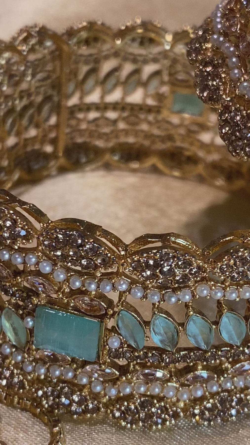 Mint & Gold Openable 2 Piece Bangle Set With Zircon Stonework & Intricate Design