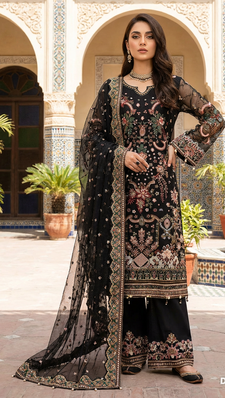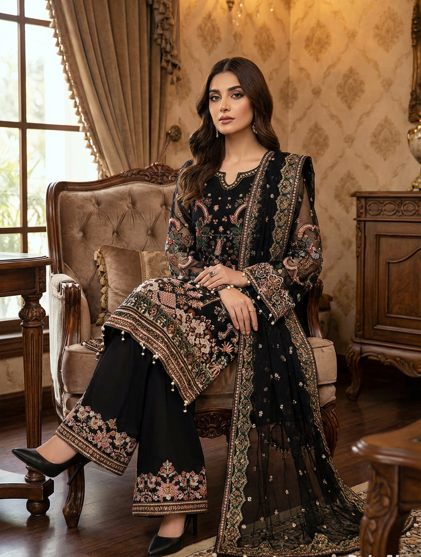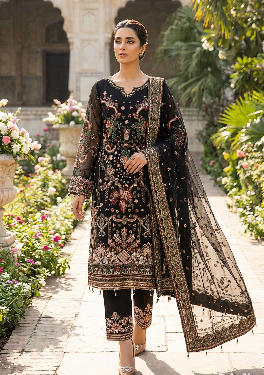 Sophisticated black suit with intricate embroidery on net fabric. Perfect for evening events.