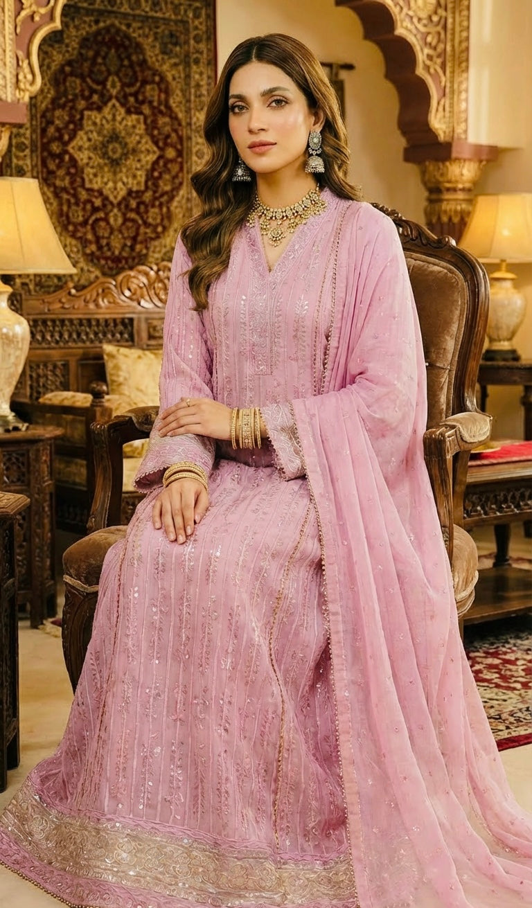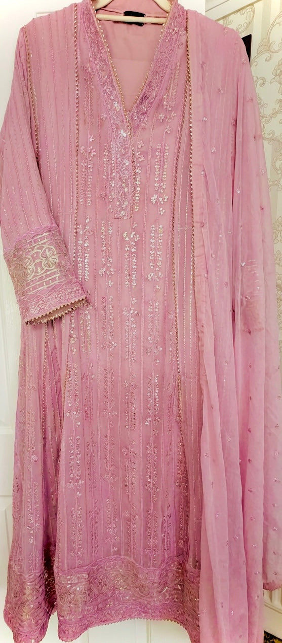What's Included:• Embroidered Chiffon Long Dress• Matching Chiffon Dupatta• Matching Silk Trousers