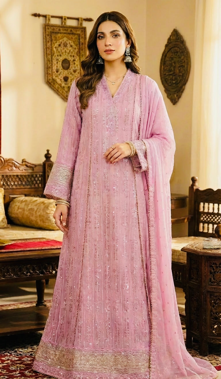 An Elegant Long-Length A-Line Ensemble In Lilac, Meticulously Crafted From Premium Chiffon Fabric. This Sophisticated Three-Piece Outfit Showcases Exquisite Embroidery Work That Captures Timeless Elegance.
