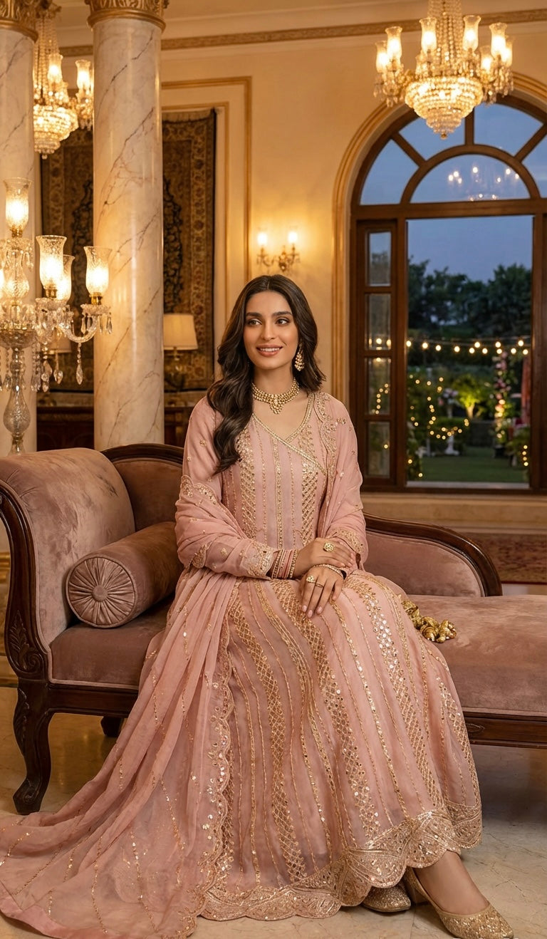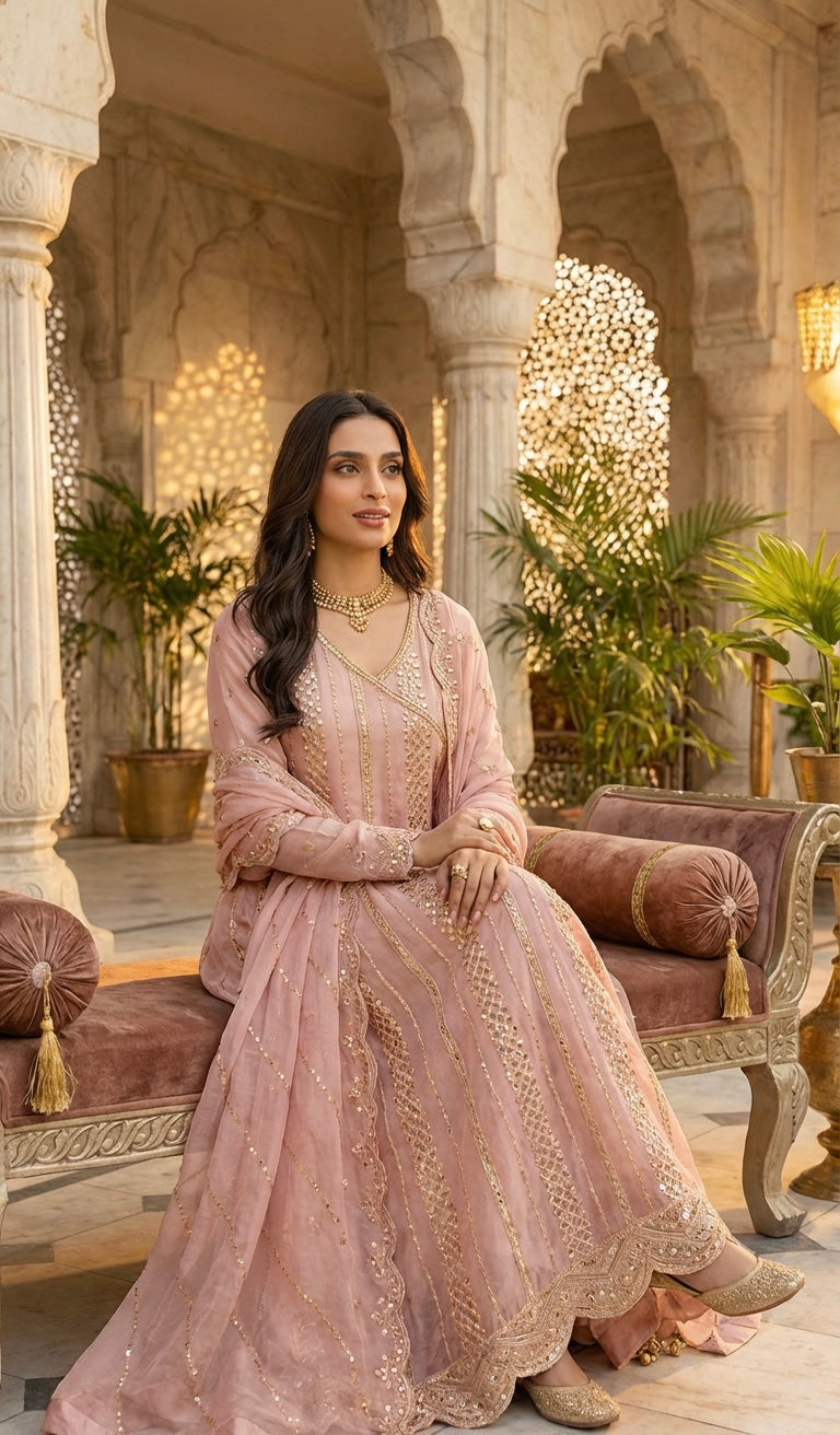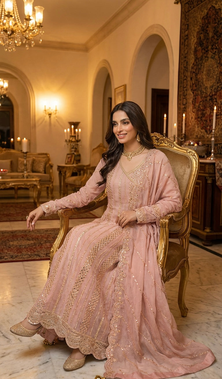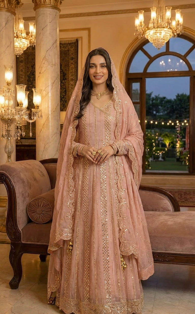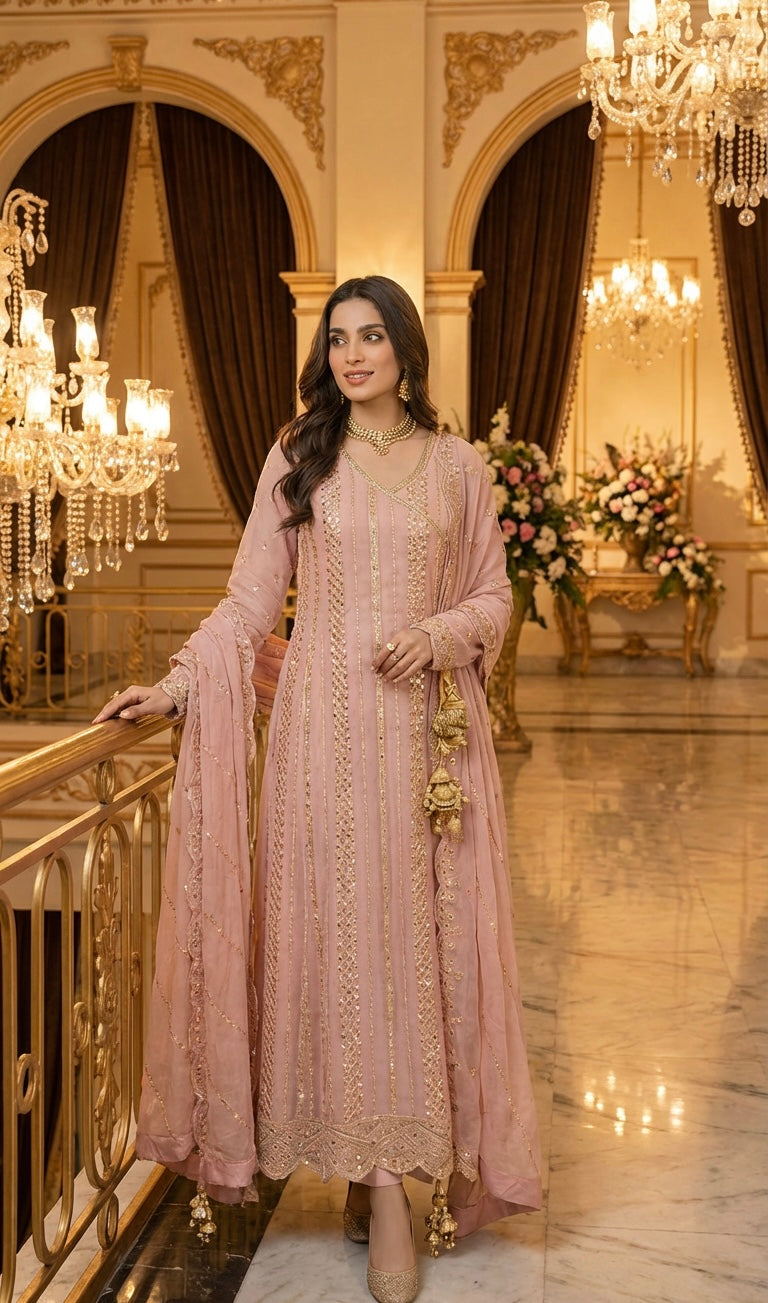 An Elegant Long-Length A-Line Ensemble In Pink, Meticulously Crafted From Premium Chiffon Fabric. This Sophisticated Three-Piece Outfit Showcases Exquisite Embroidery Work That Captures Timeless Elegance.