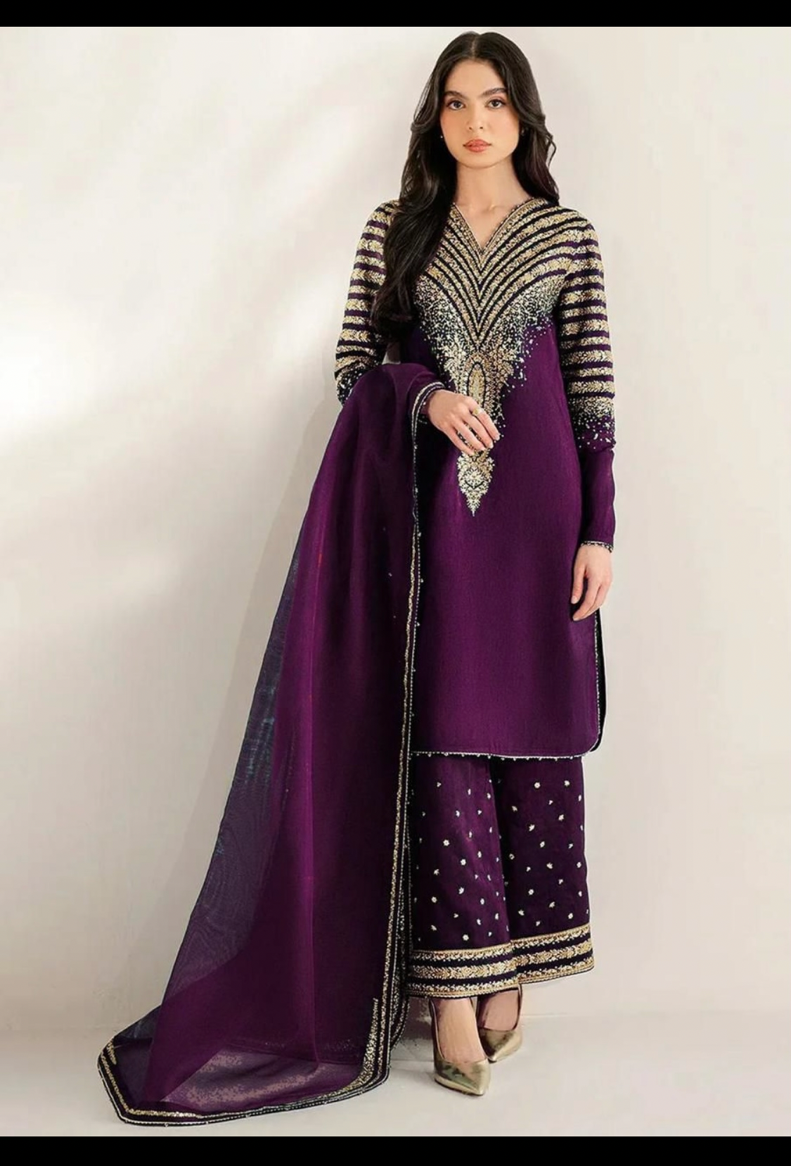 Luxurious raw silk suit inspired by Jazmin designs. Complete outfit with dress, trousers, & Organz Dupatta .