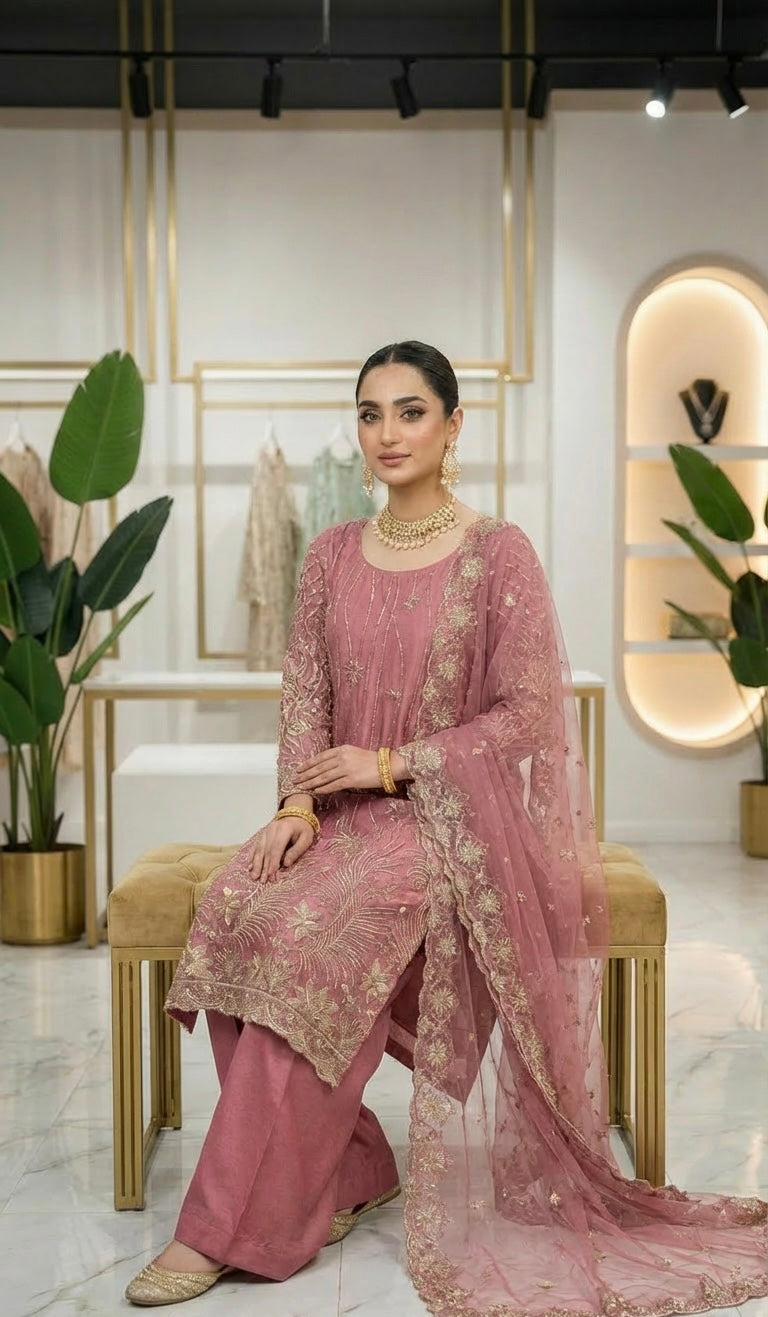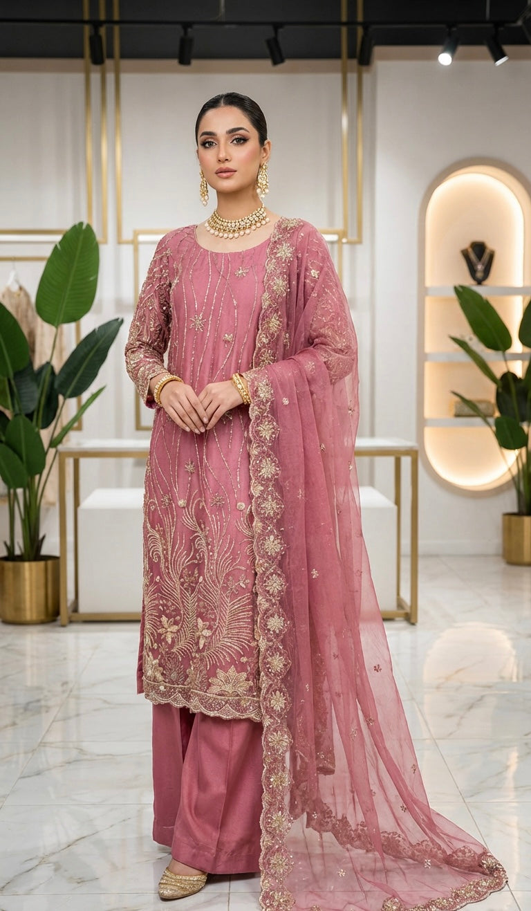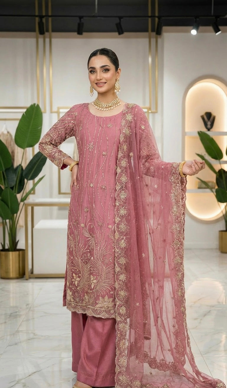A Beautiful 3 Piece Outfit With Cutdana Embroidery on Kameez & Dupatta in Traditional Style Kameez & Plain Silk Trousers