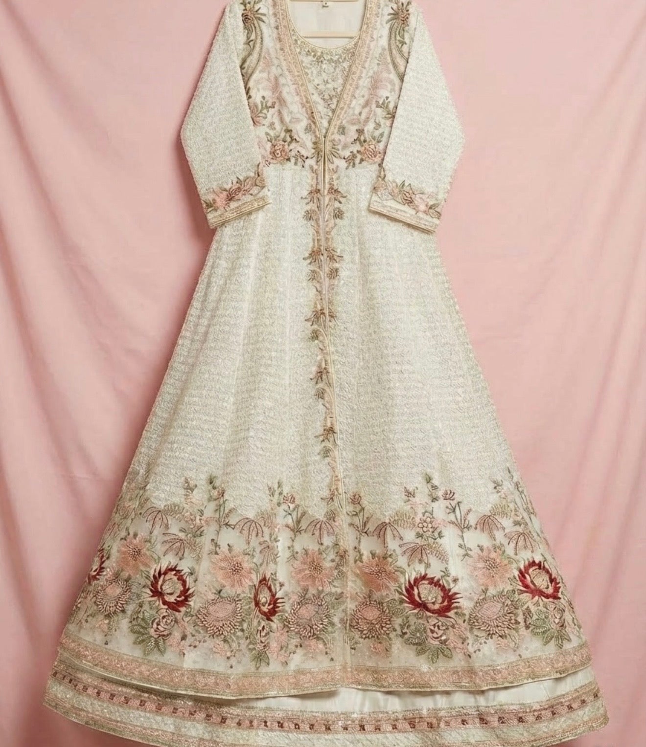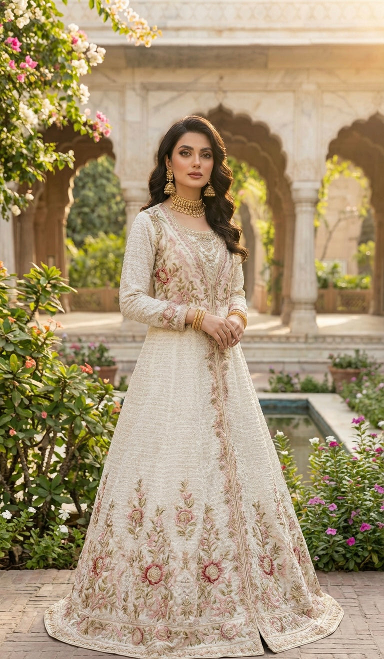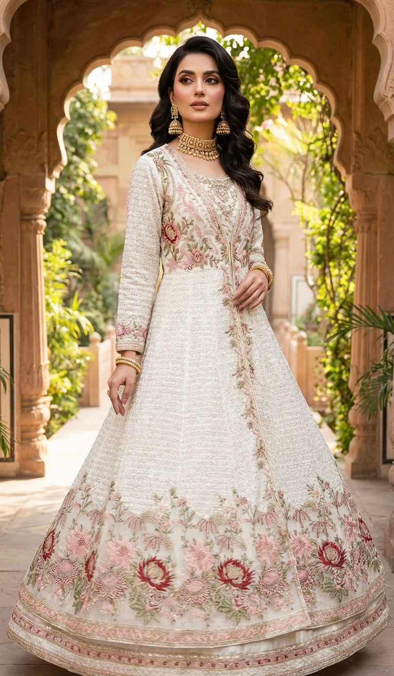 A Stunning 4 Piece Gown with a Generous Flair In Off White Adorned With Intricate Floral Embroidery That Capture Ethereal Beauty. This Elegant Piece Is Ideal For Bridal: Engagement & Formal Occasions.