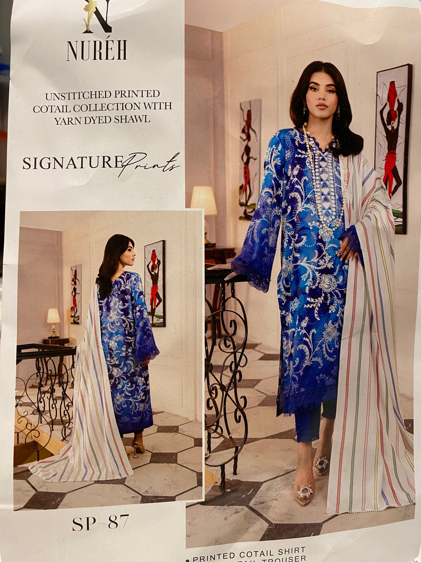 Nureh Unstitched 3 Piece Suit. Fabric:Cotail. Dupatta Yarn.