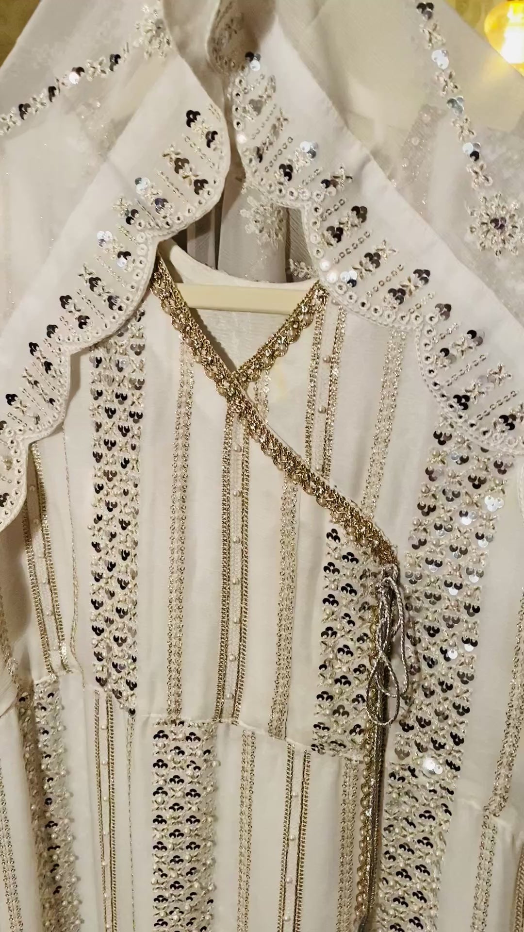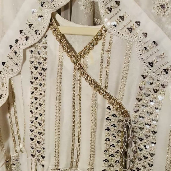Beautiful Angrakha Style Outfit in Pure Chiffon with Pearl & Sequin Work, Dress & Dupatta has Scallop Cut with Straight Silk Trousers. White