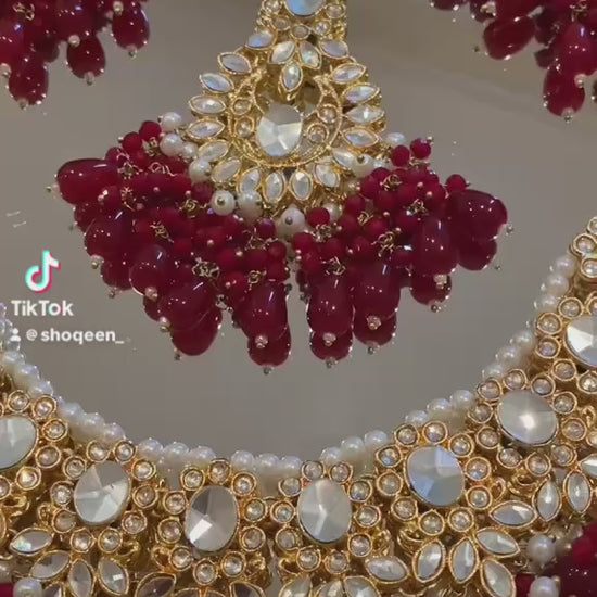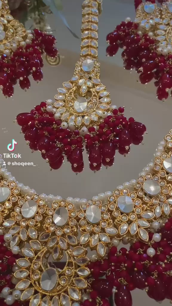 Beautiful Red & Gold Set with Bead & Stonework Set Includes Necklace, Earrings Jhoomar & Tika