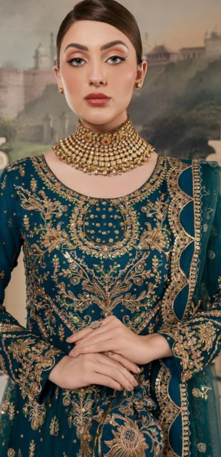 3 Piece Teal Colour Anarkali Maxi. Dress Net Fabric Organza Dupatta Polyester Crepe Trousers & Potli Bag.