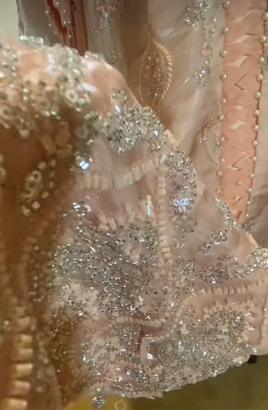 Beautiful Korean Silk with Cutdana Embroidery in Peach Ombré Effect on Dress & Matching Dupatta with Silk Trousers. Heavy Wear