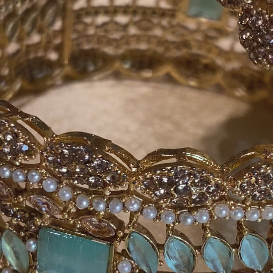 Mint & Gold Openable 2 Piece Bangle Set With Zircon Stonework & Intricate Design