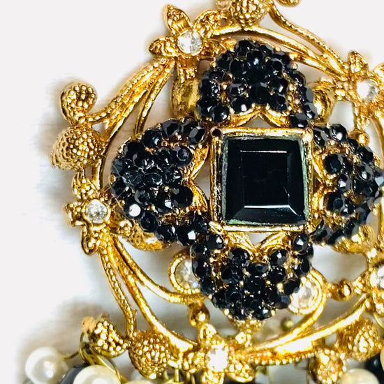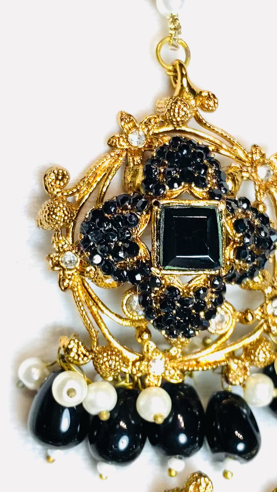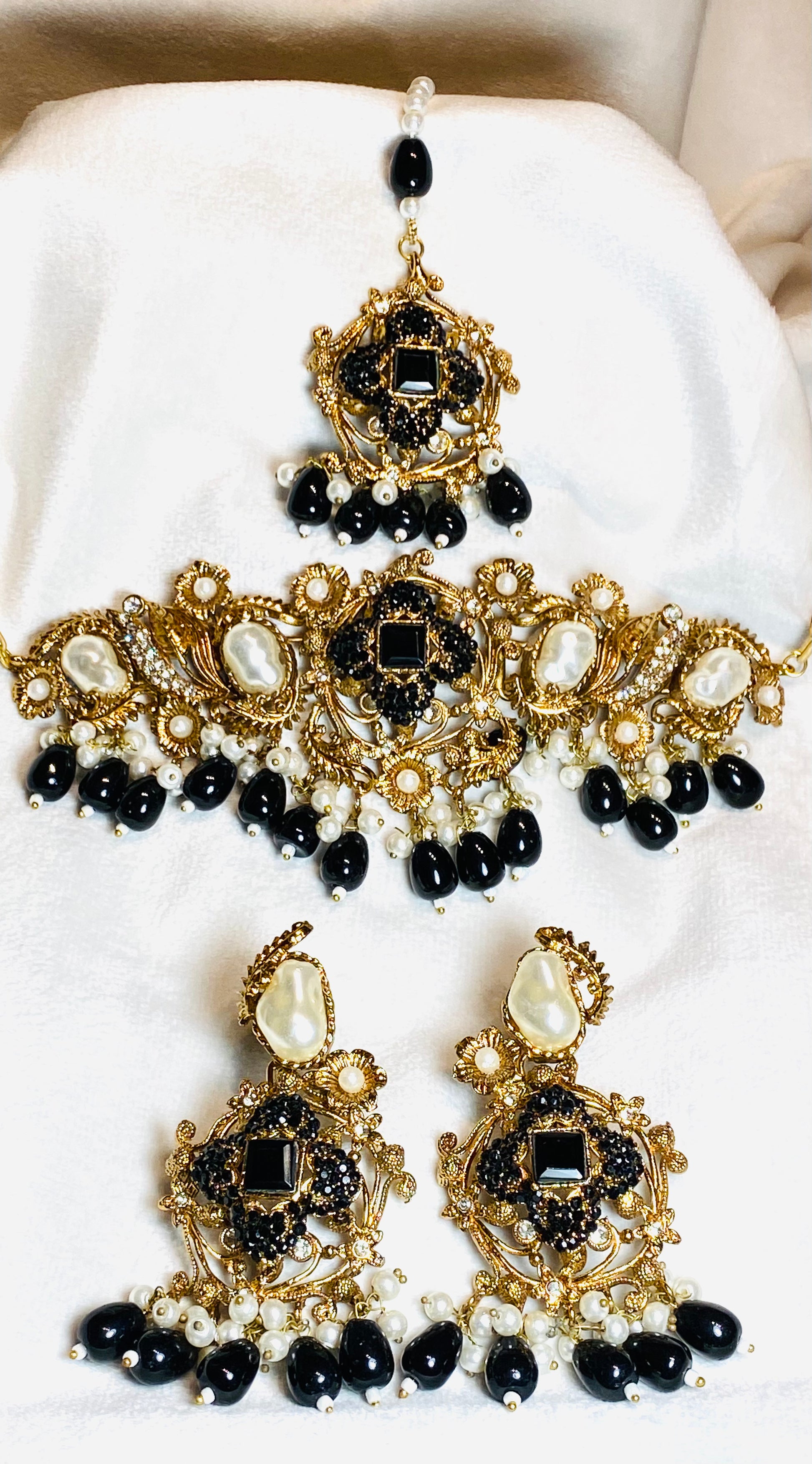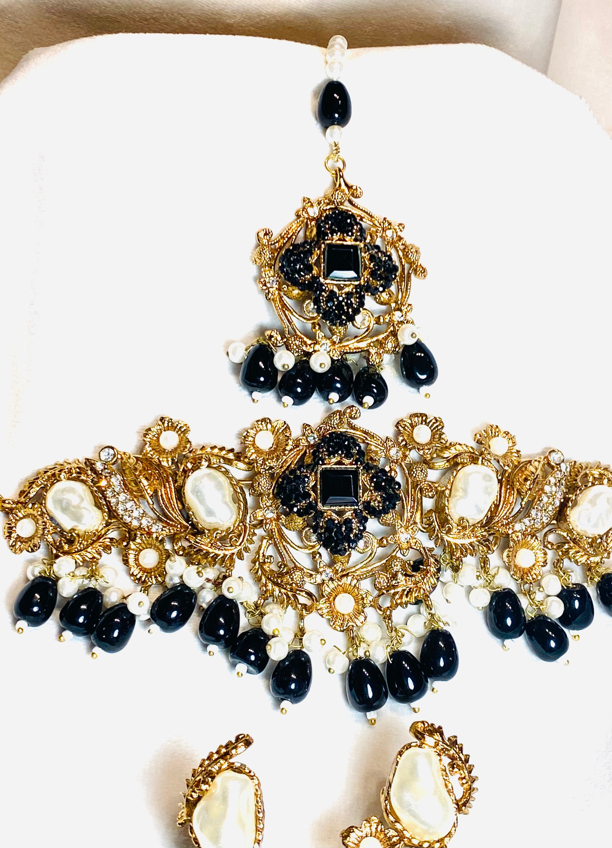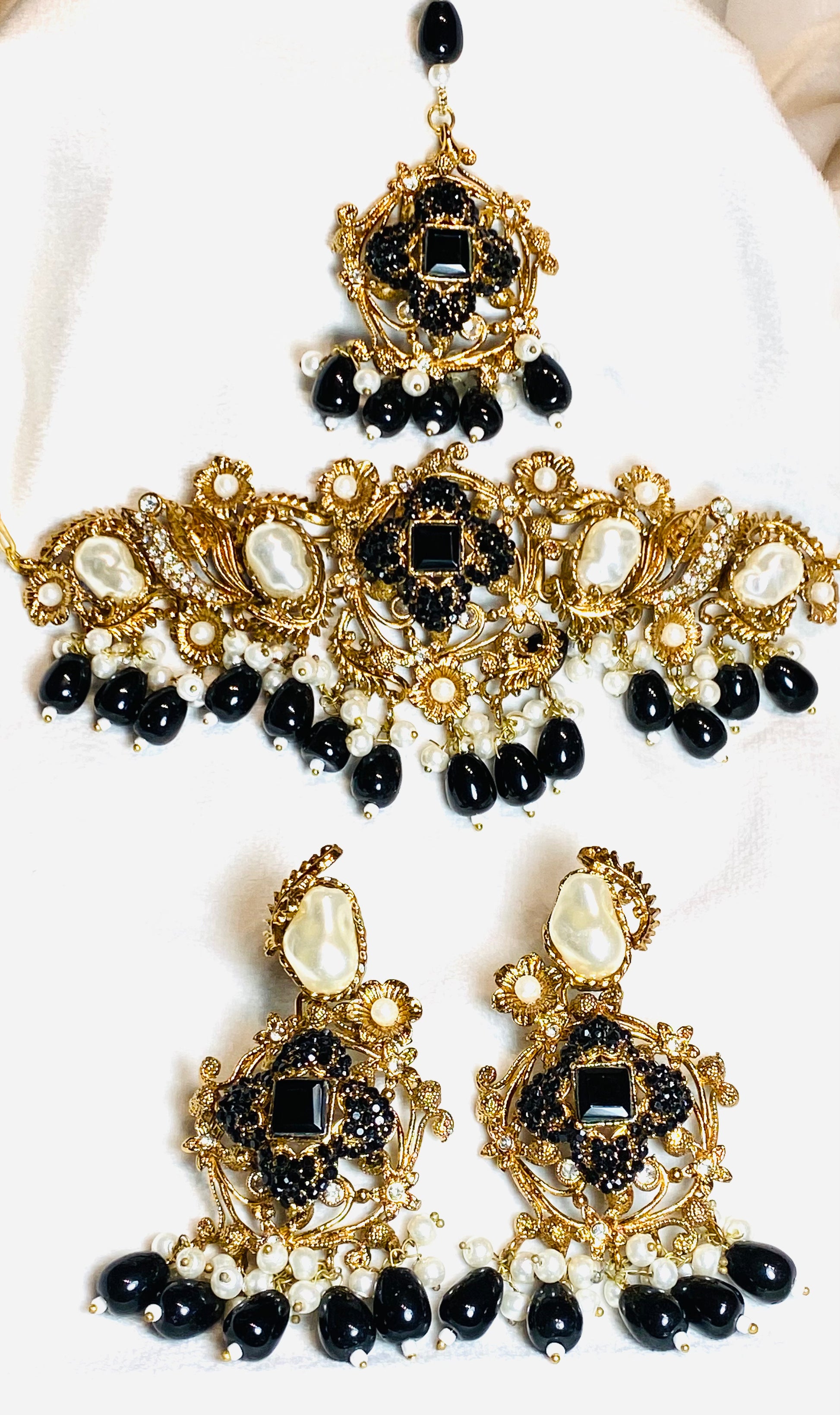 Parveen Set with Necklace, Earrings & Tika with Beautiful (Faux) Pearl & Beadwork Set in Filigree Design. Black