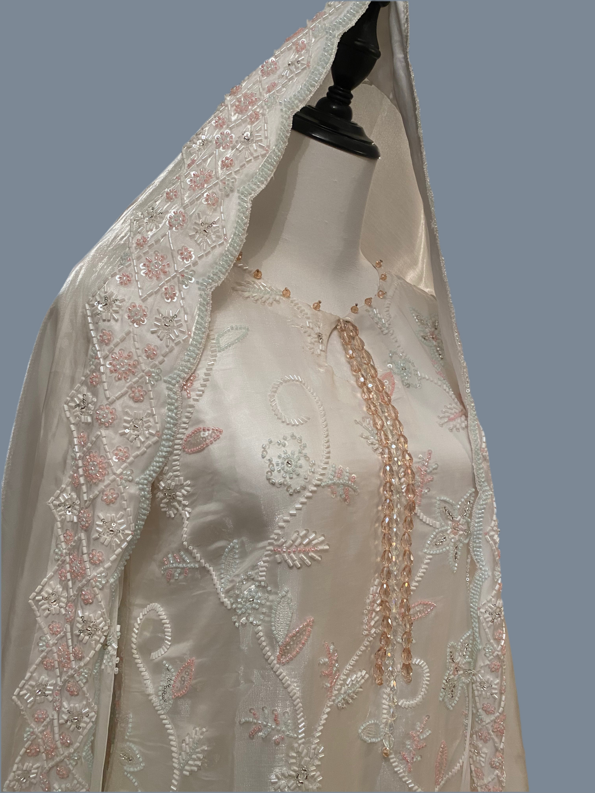 White Korean Silk Sharara Suit With Beautiful Soft Pink & hint of Blue Cutdana Embroidery on Kameez & Dupatta. Fully Lined Dress & Sharara.